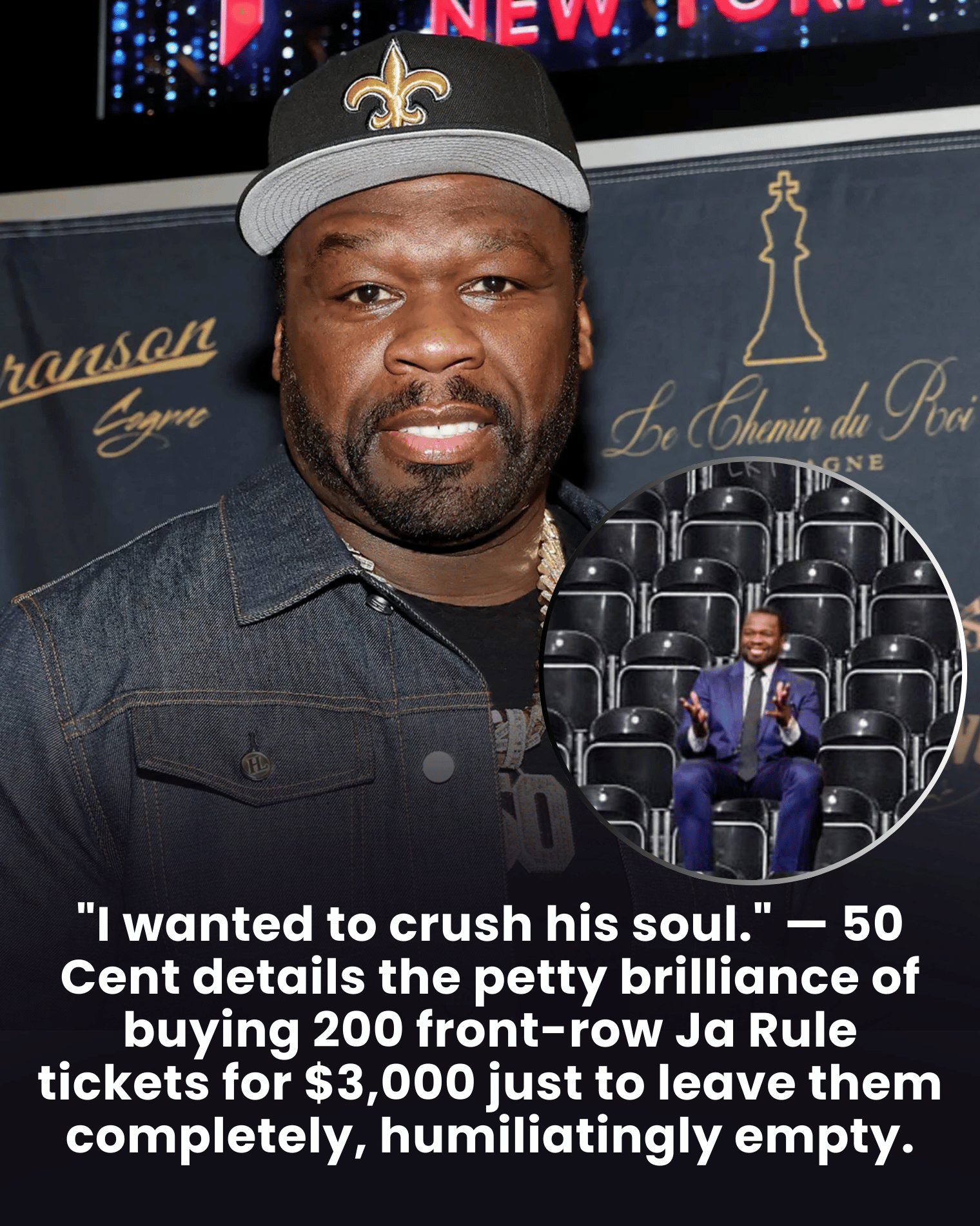 After completing the purchase, 50 Cent shared the story online, turning the stunt into an instant viral moment. He even posted a photoshopped image showing himself sitting alone among the empty seats, a playful exaggeration meant to amplify the joke.